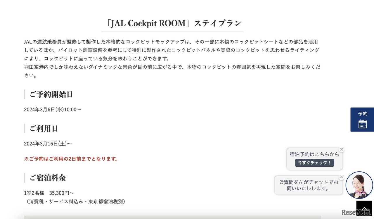 日本航空と羽田エクセルホテル東急は2024年3月6日午前10時、本物のコックピット部品を活用したコンセプトルーム「JAL Cockpit ROOM」の予約販売を開始した。1室2名3万5,300円~(消費税・サービス料込・東京都宿泊税別)。