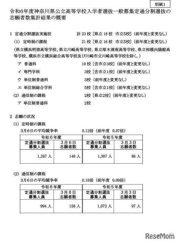 神奈川県教育委員会は2024年3月6日、2024年度(令和6年度)神奈川県公立高等学校入学者選抜一般募集定通分割選抜の志願者数集計結果を発表した。出願締切時点で、定時制は横浜翠嵐(普通)0.11倍、希望ケ丘(普通)0.36倍など。競争率1.00倍を超える学校はなかった。