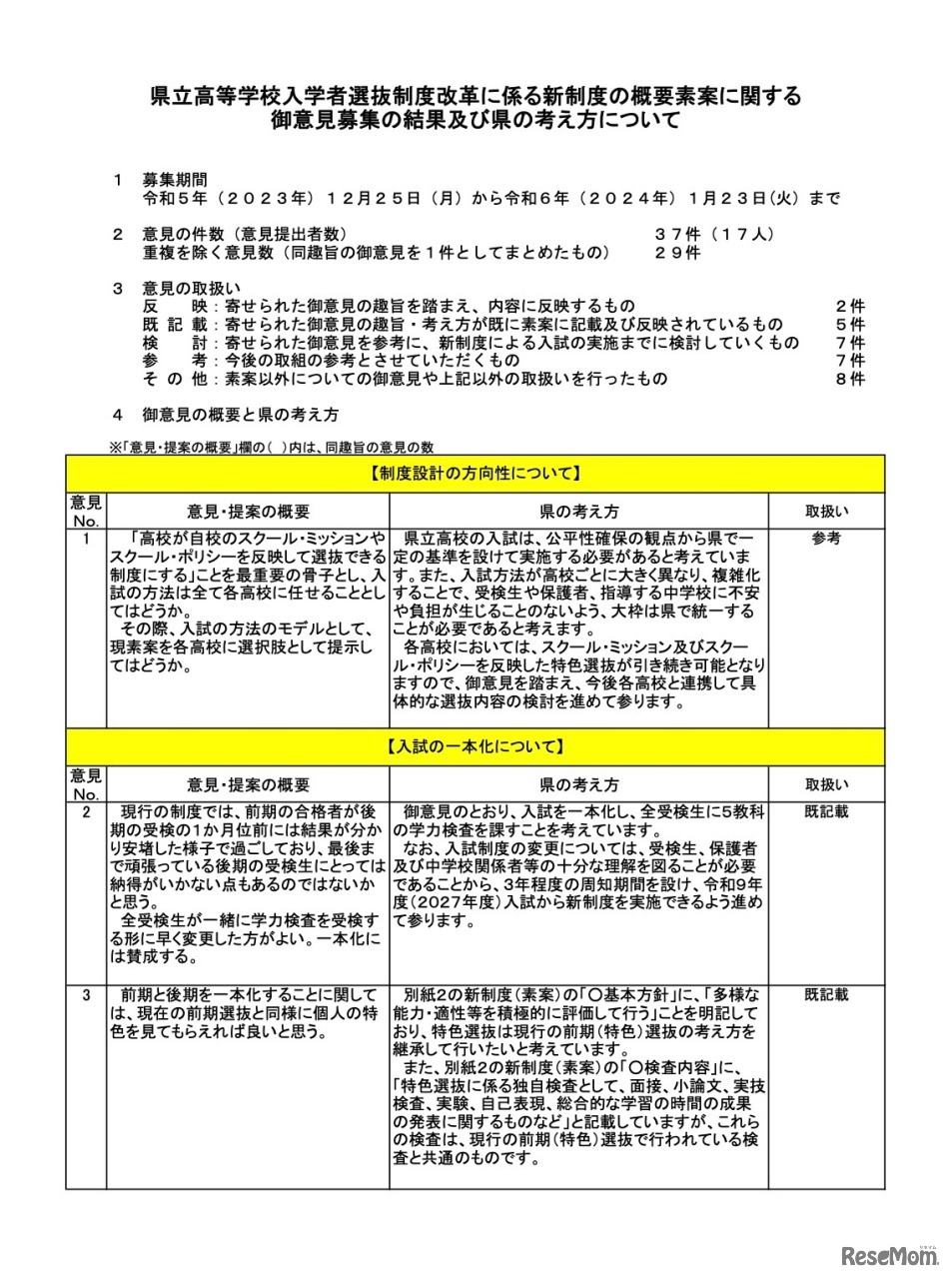 県立高等学校入学者選抜制度改革に係る新制度の概要素案に関する御意見募集の結果および県の考え方について(一部)