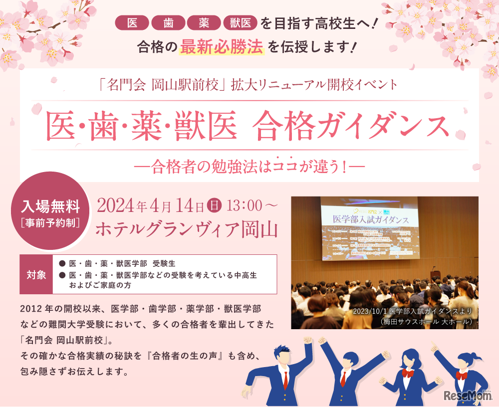 名門会は2024年4月14日、医・歯・薬・獣医学部受験生、受験を考えている中高生およびその家族を対象に、ホテルグランヴィア岡山にて「医・歯・薬・獣医 合格ガイダンス」を開催する。入場無料。事前予約制。