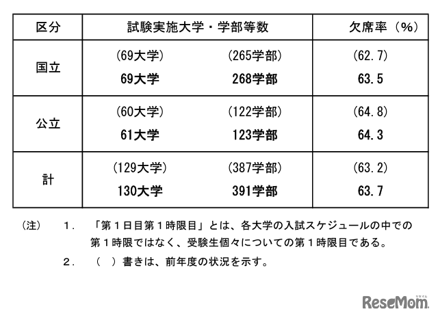文部科学省は2024年3月12日、2024年度(令和6年度)国公立大学入学者選抜 後期個別学力検査等第1日目第1時限目(受験生個々についての第1時限目)の受験状況を発表した。欠席率は、国立63.5%、公立64.3%、計63.7%だった。