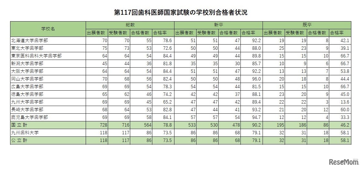 厚生労働省が2024年3月15日に発表した第117回歯科医師国家試験の合格状況によると、学校別で合格率がもっとも高いのは、「東京歯科大学」97.7%。新卒者の合格率は、「東京歯科大学」など9校で90.0%を超えた。
