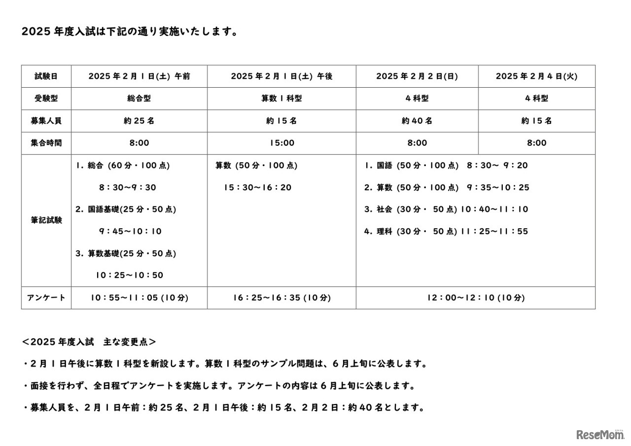 光塩女子学院中等部は、2025年度(令和7年度)入試について実施概要とおもな変更点を公表した。大きな変更点として、2025年度より2月1日午後に「算数1科型」入試を新設。あわせて、試験ごとの募集人員の配分を変更する。新設の算数1科型のサンプル問題は、6月上旬に公表される予定。