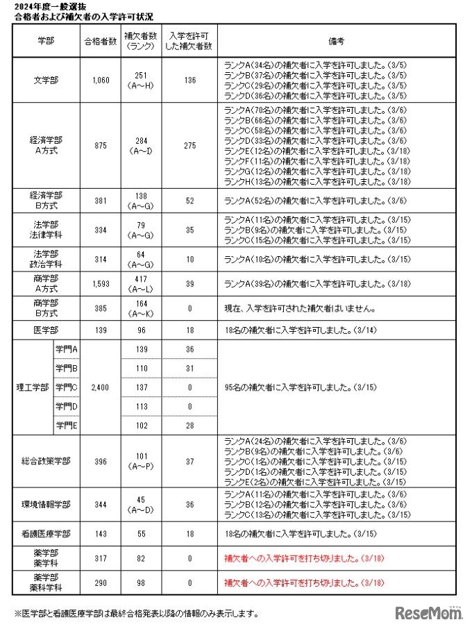 慶應義塾大学は2024年3月18日、2024年度一般選抜の合格者と補欠者の入学許可状況を公表した。3月18日午後4時現在、薬学部のみで補欠者への入学許可を打ち切っている。2023年度一般選抜では、補欠者のうち計1,034人の入学を許可している。