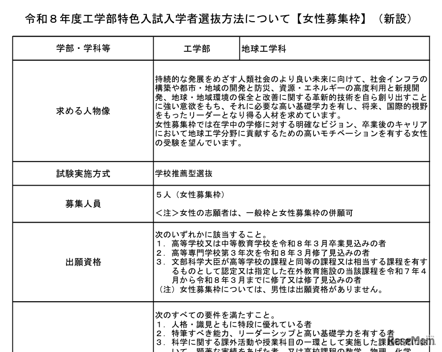 京都大学は2024年3月21日、2026年度(令和8年度)入学者選抜から、理学部と工学部の特色入試において、女性募集枠を新設すると発表した。理学部は総合型選抜で15人、工学部は学校推薦型選抜で24人を女性募集枠とすることで、女性比率を向上させる狙い。