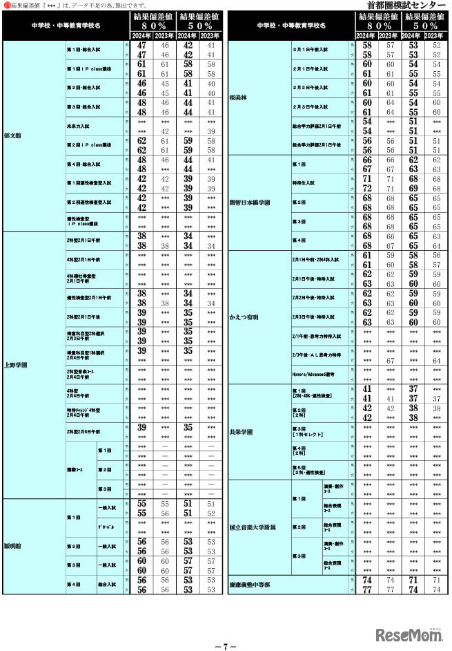 首都圏模試センターは2024年3月25日、2024年中学入試「結果偏差値一覧」を公開した。合格率80%と50%の偏差値を男女共学入試別に掲載している。男子は開成・聖光・筑波大駒場が78、女子は桜蔭が78、豊島岡女子が77、女子学院・洗足が76など。