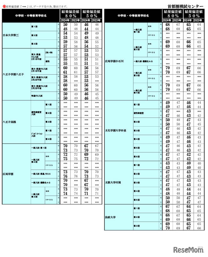 画像出典:首都圏模試センター 2024年 中学入試結果偏差値一覧(合格率80%・50%)