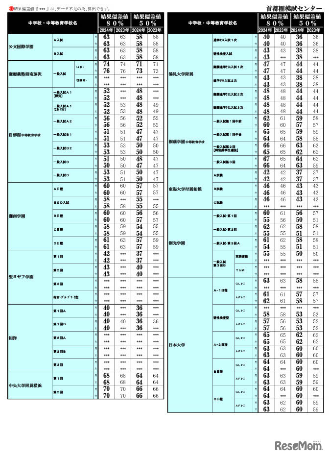画像出典:首都圏模試センター 2024年 中学入試結果偏差値一覧(合格率80%・50%)