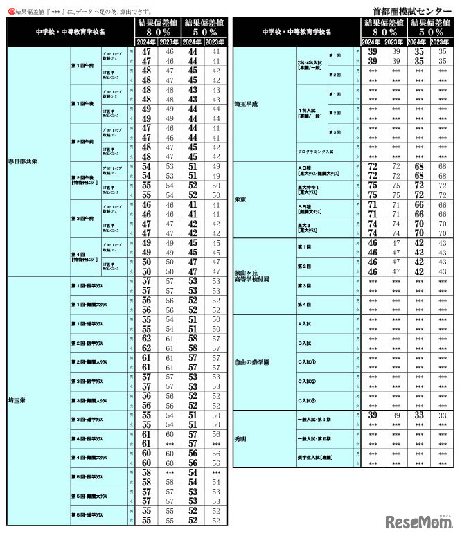 首都圏模試センターは2024年3月25日、2024年中学入試「結果偏差値一覧」を公開した。合格率80%と50%の偏差値を男女共学入試別に掲載している。男子は開成・聖光・筑波大駒場が78、女子は桜蔭が78、豊島岡女子が77、女子学院・洗足が76など。
