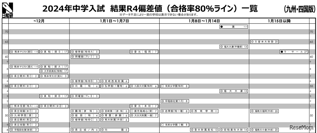日能研は2024年3月26日、2024年中学入試「結果R4偏差値一覧(首都圏・関西・東海・九州)」を公開した。日能研生の入試結果をもとに算出した合格可能性80%ラインの偏差値は、男子が開成(72)、筑波大駒場(72)、女子が桜蔭(69)、渋谷幕張2(69)など。