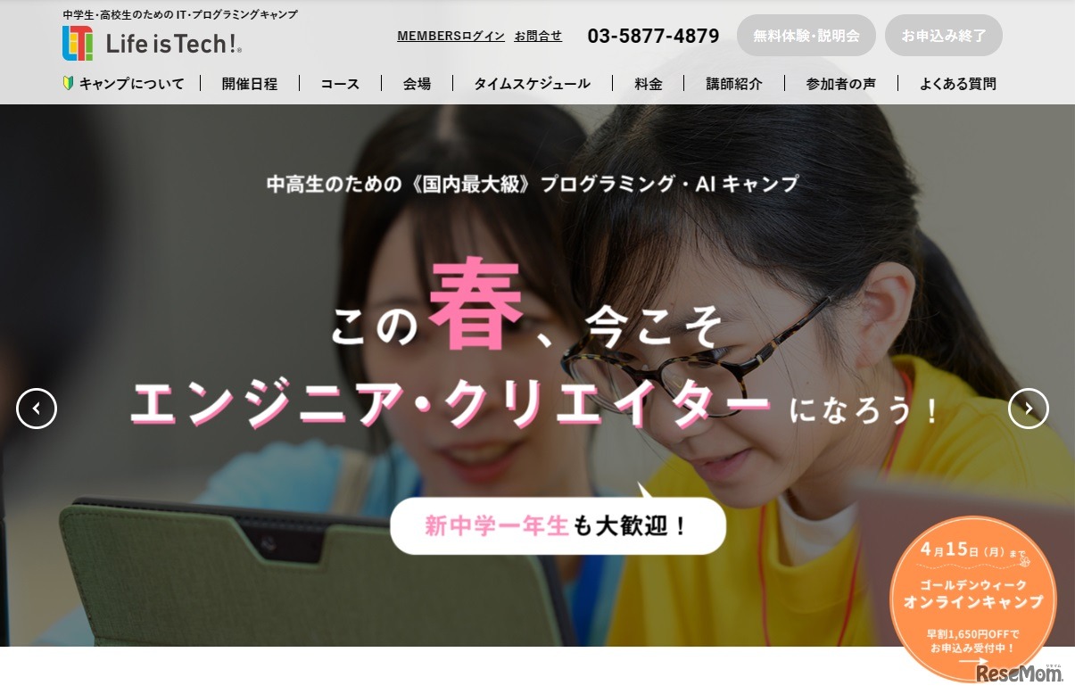ライフイズテックは、2024年5月3日から6日の期間、中高生向けプログラミング・AIキャンプ「Life is Tech ! ONLINE CAMP」を開催する。4日間でプログラミングやアプリ・ゲーム制作、デジタルアートなどを学ぶ。参加費は5万9,400円~。4月15日まで早割実施中。