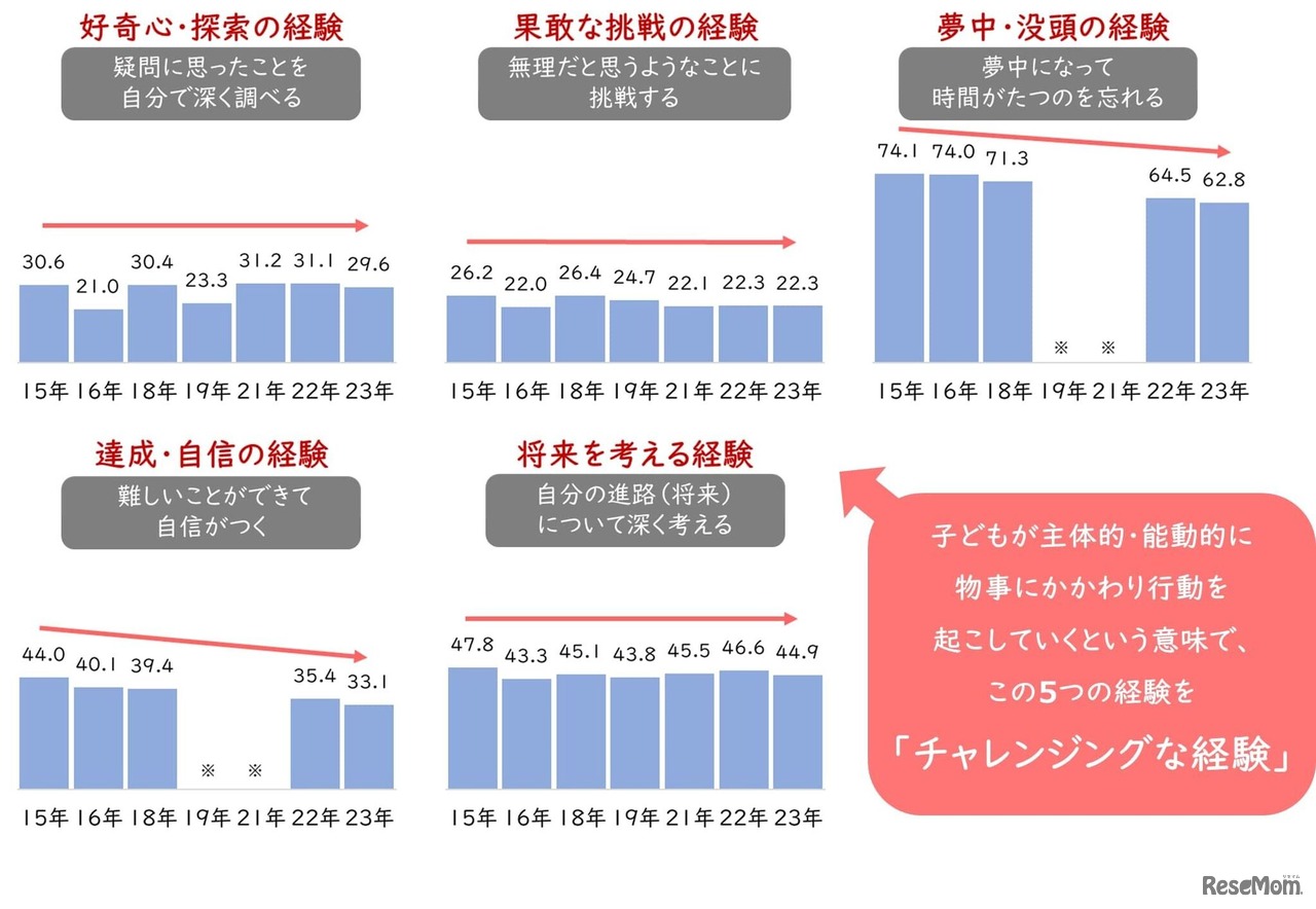 チャレンジングな経験(経年比較、小4~高3生) 【2015~23年データ】(%)