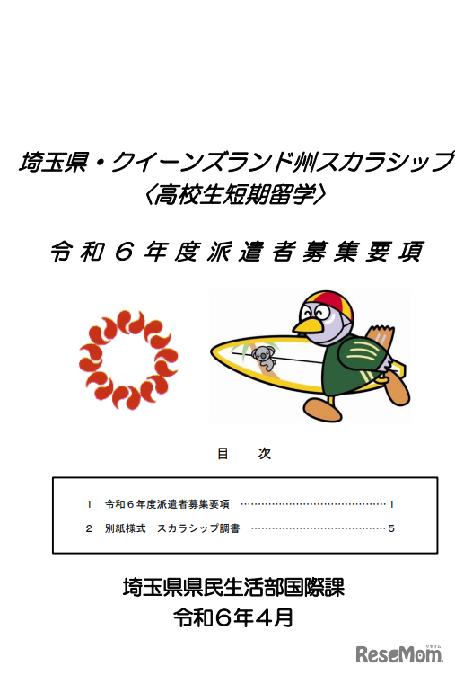 埼玉県は2024年4月16日、高校生対象のオーストラリア短期留学「埼玉県・クイーンズランド州スカラシップ」の募集を開始した。留学期間は7月24日~8月9日で、授業料およびホームステイ費を免除する。募集人数は6人。申込締切は5月13日。