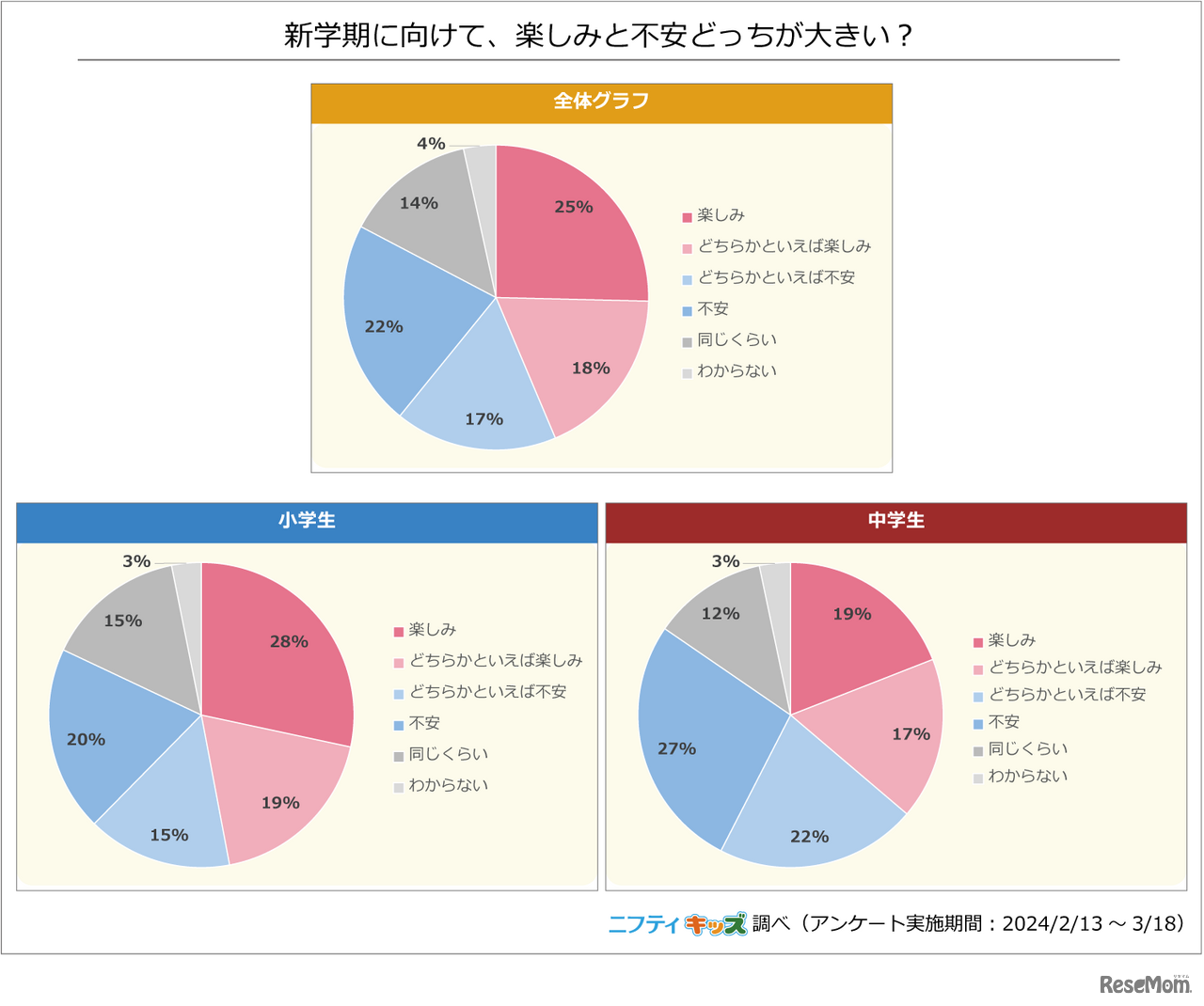 ニフティは「ニフティキッズ」で「新学期」に関するアンケート調査を実施し、2024年4月18日に結果を公開した。半数近くの小中学生が新学期を楽しみにしているが、「勉強が難しくなること」「新しいクラスになじめるか」を不安に感じていることがわかった。