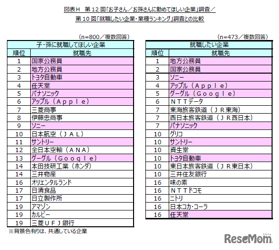第12回「お子さん/お孫さんに勤めてほしい企業」調査:第10回「就職したい企業・業種ランキング」調査との比較