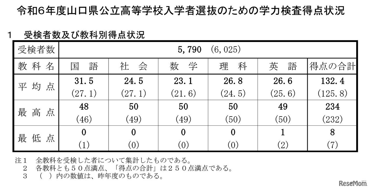 山口県教育委員会は2024年4月24日、2024年度(令和6年度)山口県公立高等学校入学者選抜の学力検査得点状況などを公表した。学力検査は、社会を除く4教科で前年度より平均点が上昇。5教科の得点合計の平均点は132.4点で、前年度を6.6点上回った。
