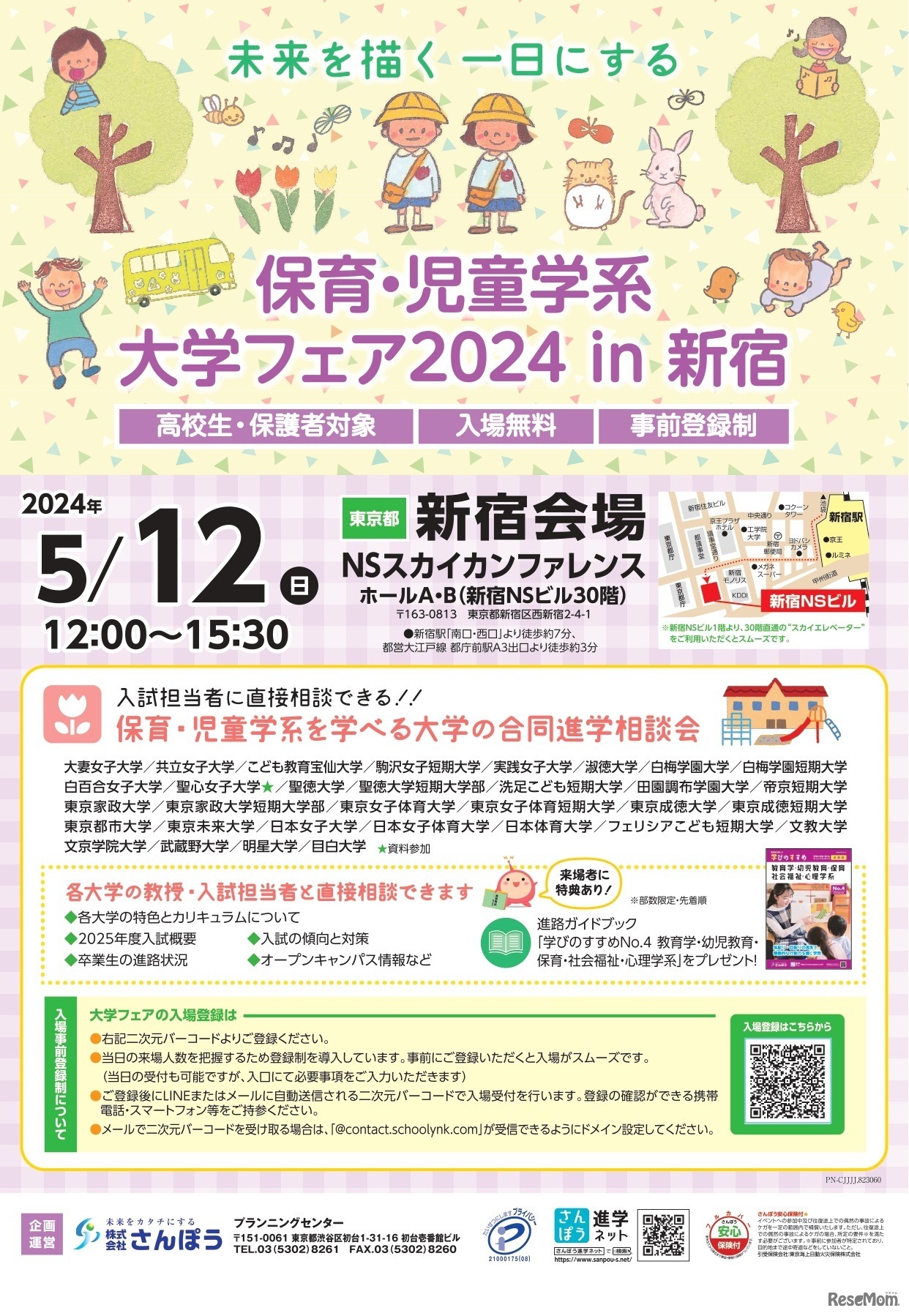 さんぽうは、「保育・幼児教育・児童学系大学」進学相談会を2024年5月12日に、「グローバル系/外国語・国際系大学」進学相談会を5月26日に新宿NSビルにて開催する。首都圏の大学を一度に多数比較し、各校と個別相談ができる。入場無料、事前登録制。