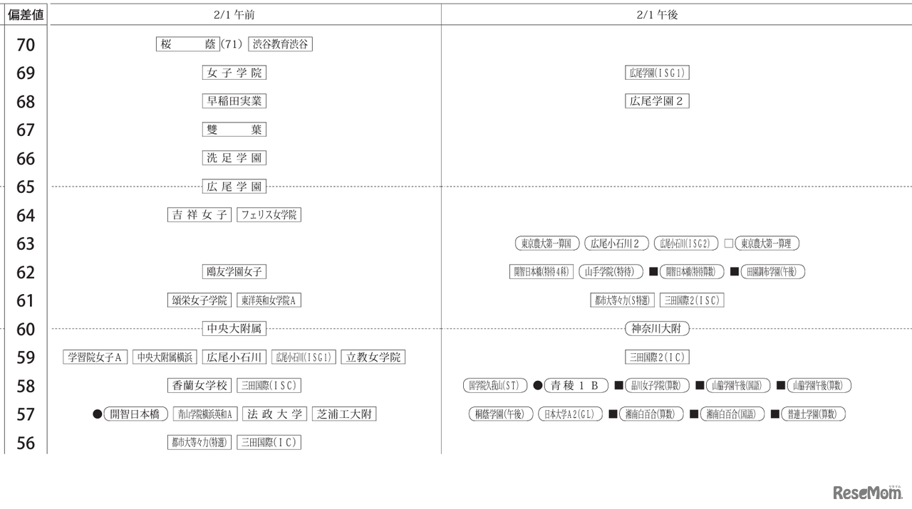 画像出典:四谷大塚ドットコム 2024年入試結果偏差値、女子2月1日