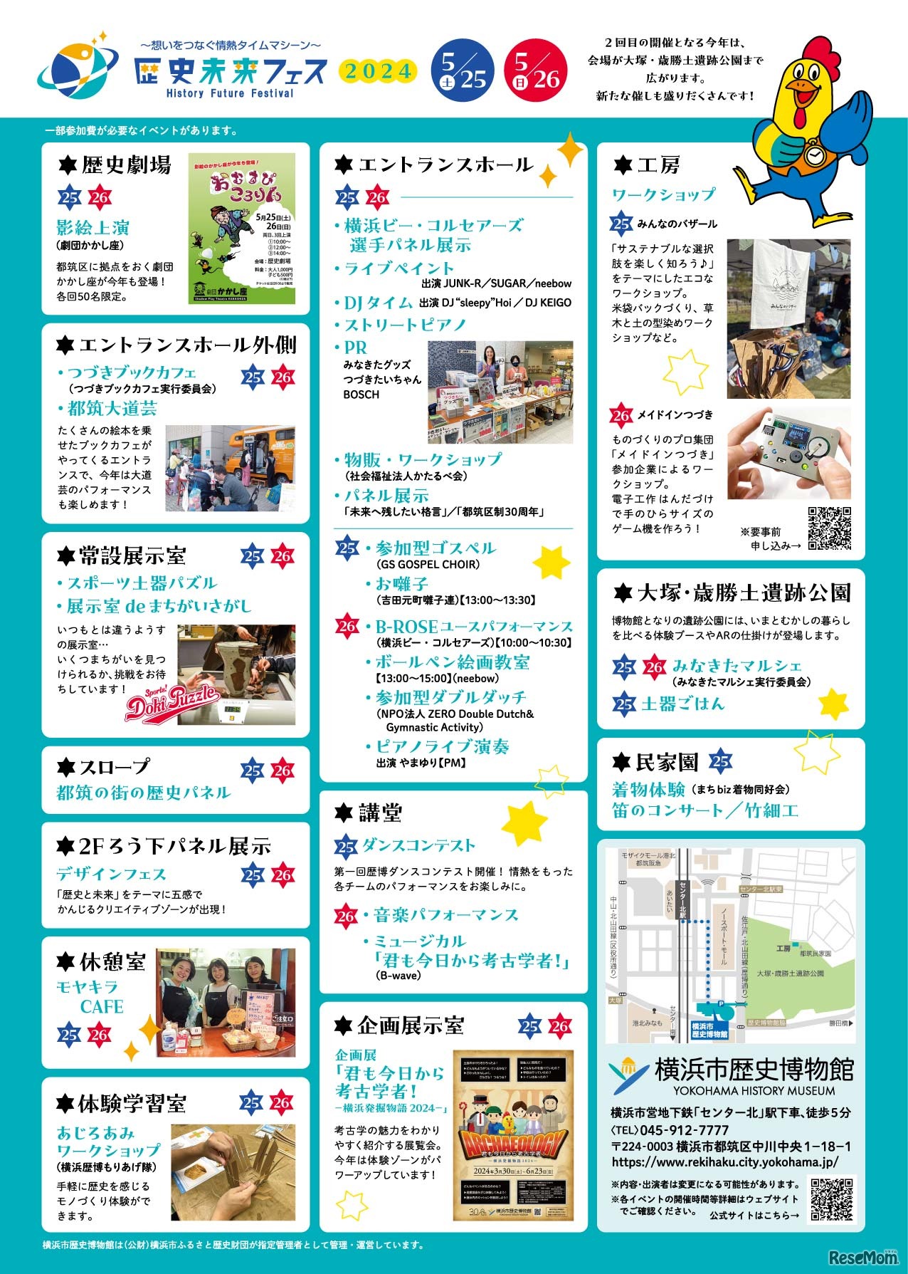 2024年5月25日と26日、第2回「歴史未来フェス」が開催される。横浜市歴史博物館、大塚・歳勝土遺跡公園、都筑民家園の各会場で多彩なワークショップをはじめ物販店舗、キッチンカーの出店、アートパフォーマンスなどさまざまな企画が用意されている。入場料無料。