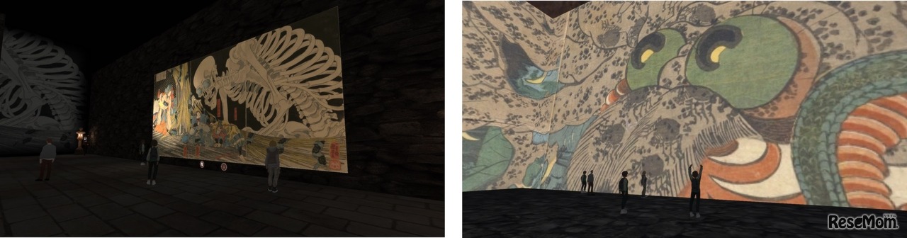 妖怪画の展示(左)と没入型のメタバースおばけ屋敷(右)