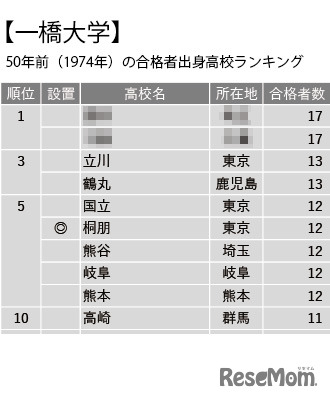 画像出典:大学通信 一橋大学 50年前(1974年)の合格者出身高校ランキング