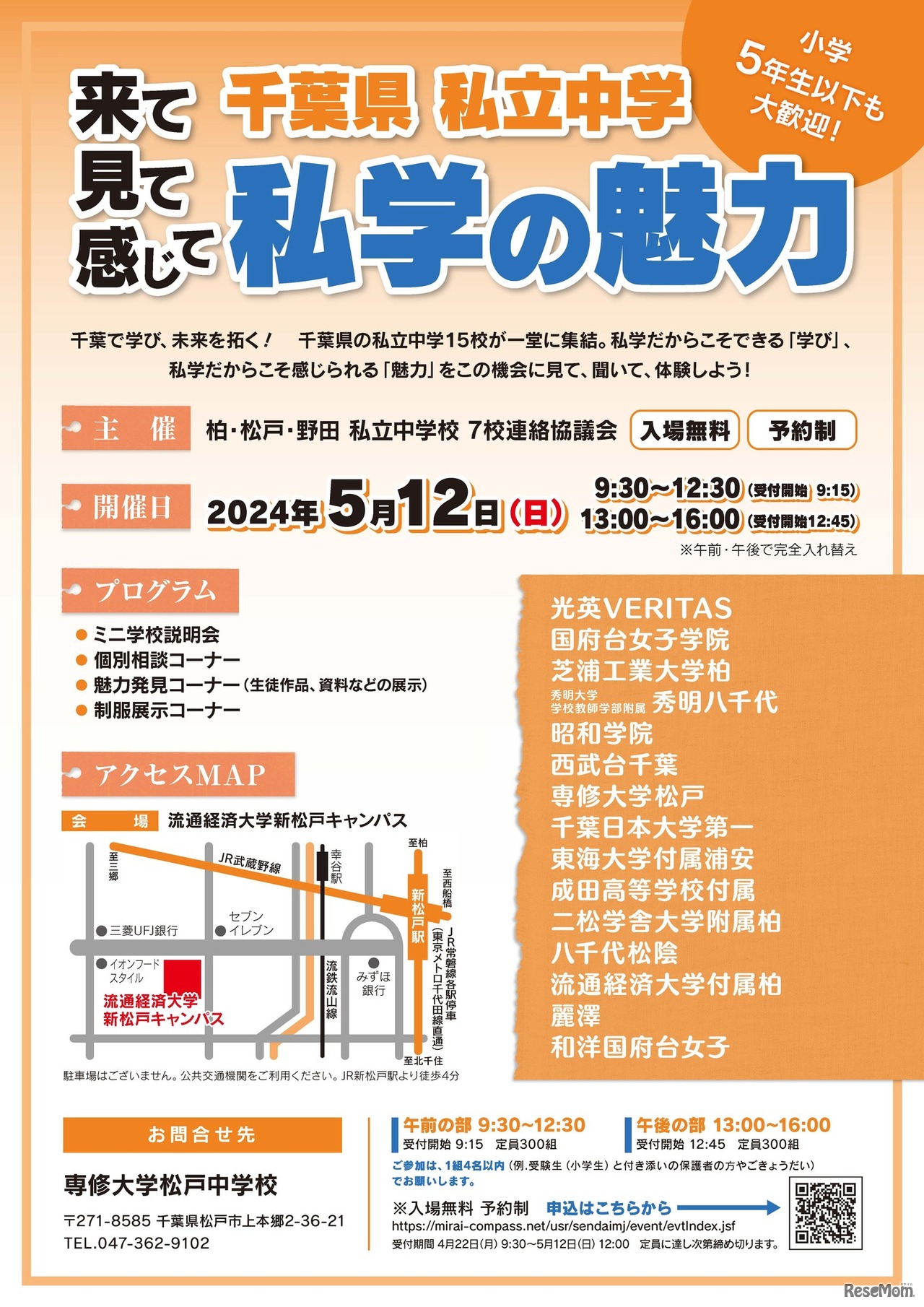 千葉県の私立中学15校が一堂に集まる合同説明会「私学の魅力2024」が2024年5月12日、流通経済大学 新松戸キャンパスにて開催される。Webサイトからの事前予約で、午前・午後それぞれ300組を受け付ける。小学5年生以下も歓迎。1組4名以内、入場無料。