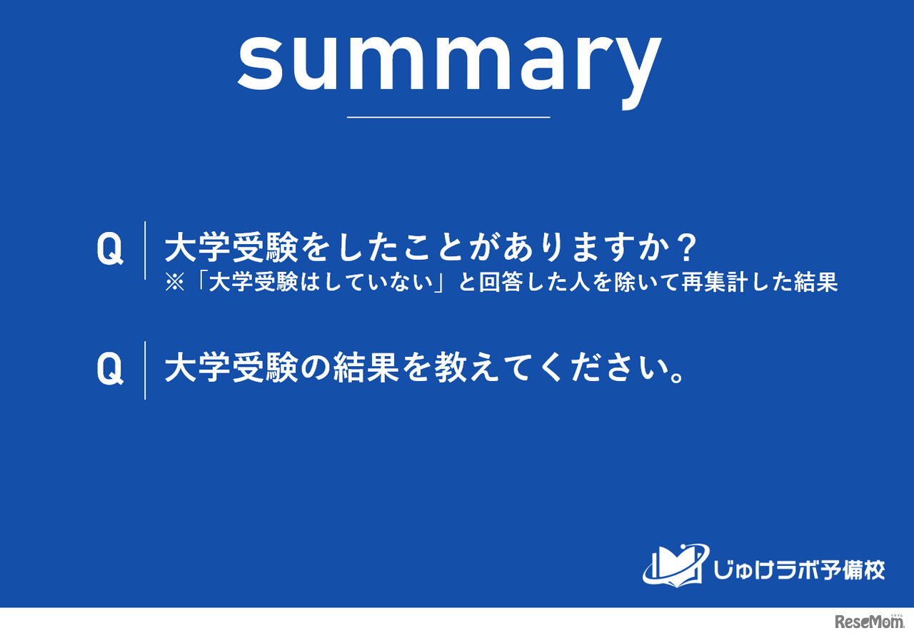 じゅけラボ予備校は2024年5月7日、大学受験の合否に関するアンケート調査の結果を発表した。現役合格率は88.1%で、そのうち約2割は第一志望に落ちても浪人を選択せず第二志望以降の大学へ進学したことがわかった。