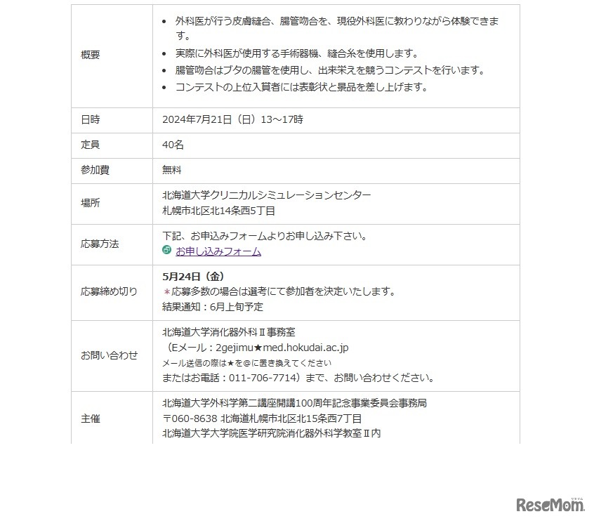 北海道大学は2024年7月21日、外科学第二講座開講100周年記念事業 未来外科医セミナー「集まれ、未来の外科医たち」を開催する。外科医が行う皮膚縫合、腸管吻合を外科医に教わりながら体験できる。対象は中学生と高校生。参加無料。定員40名。抽選制。申込期限は5月24日。