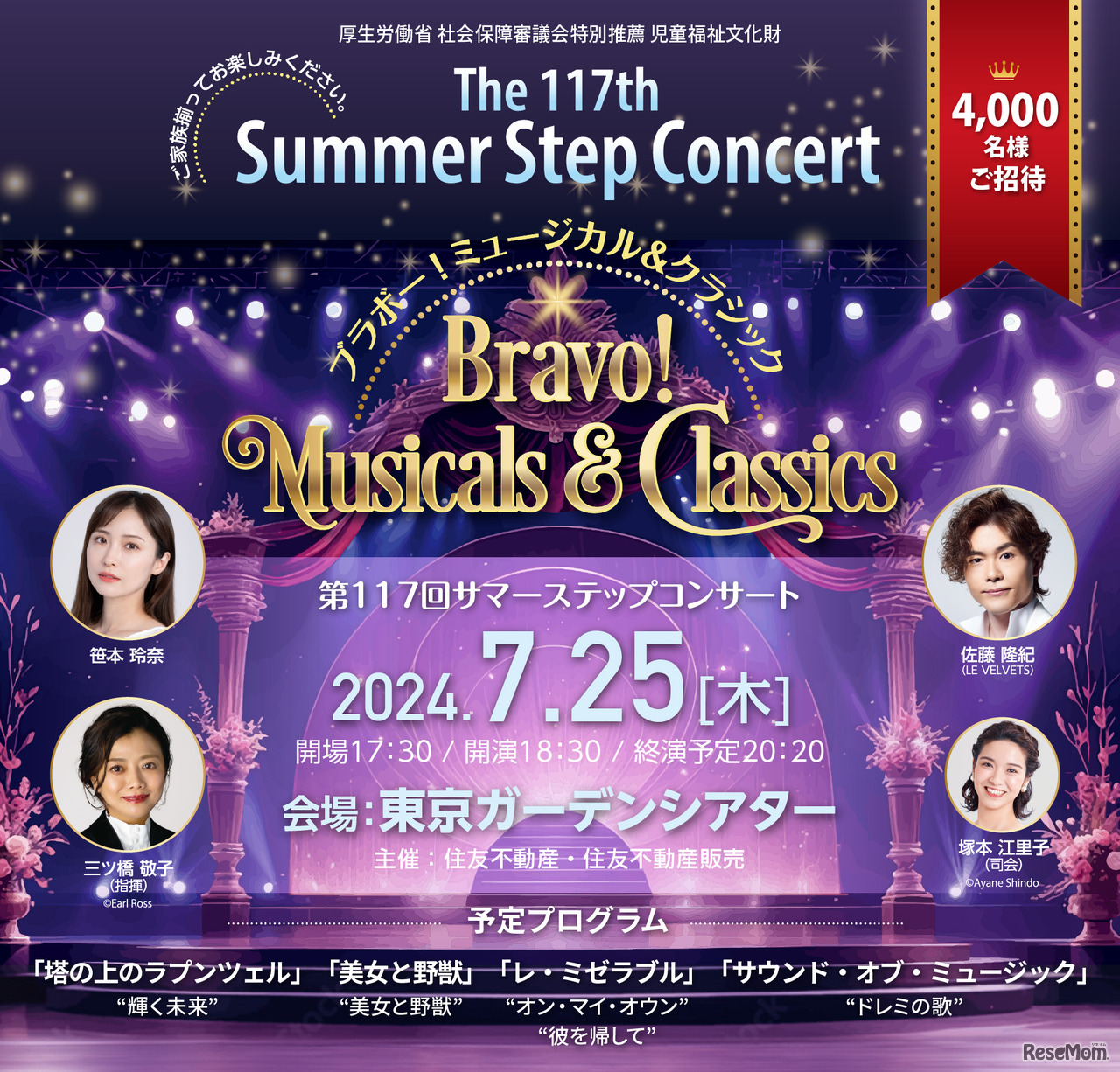 住友不動産グループは2024年7月25日、家族そろって楽しめるコンサート「第117回サマーステップコンサート~ブラボー!ミュージカル&クラシック~」を東京・有明の「東京ガーデンシアター」で開催する。4,000名を無料招待。応募は6月27日午後5時まで。