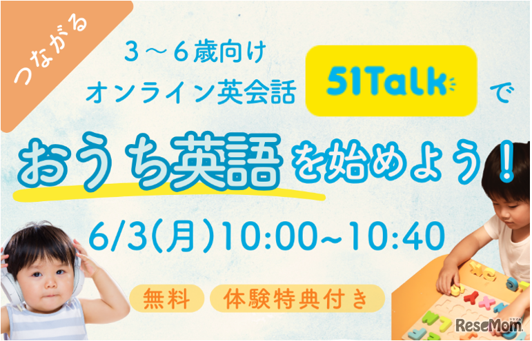51Talk Japanは2024年6月3日、Lucorが運営するママ向けオンラインコミュニティPULMOと共同で、保護者を対象に「3~6歳向けオンライン英会話51Talkでおうち英語を始めよう!」をオンライン開催する。定員30名。参加費無料。