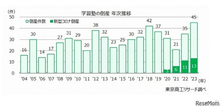 2023年の学習塾倒産は、過去20年間で最多の45件にのぼることが、東京商工リサーチの調査結果より明らかになった。原因は「販売不振」が最多の41件で、全体の91.1%を占めた。市場が拡大をたどる一方で、進学実績や授業方法など、特徴のない塾の生き残りは厳しさを増しているという。