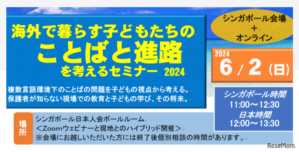 海外で暮らす子供たちの「ことばと進路」を考えるセミナーが2024年6月2日、シンガポール会場とオンラインで開催される。複数言語環境下のことばの問題を子供の視点から考える。参加無料。申込みはPeatixから受け付ける。