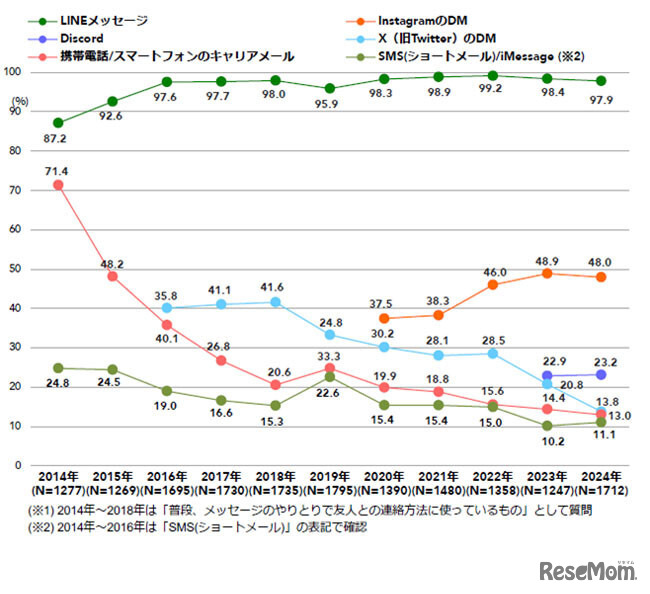 東京工科大学は2024年5月14日、2024年度の新入生を対象に実施したSNSなどコミュニケーションツールの利用実態調査の結果を公表した。1位は10年不動の「LINE」で利用率99.2%。「Instagram」は9年連続増で3位、微減に転じた2位「X」とは僅差だった。