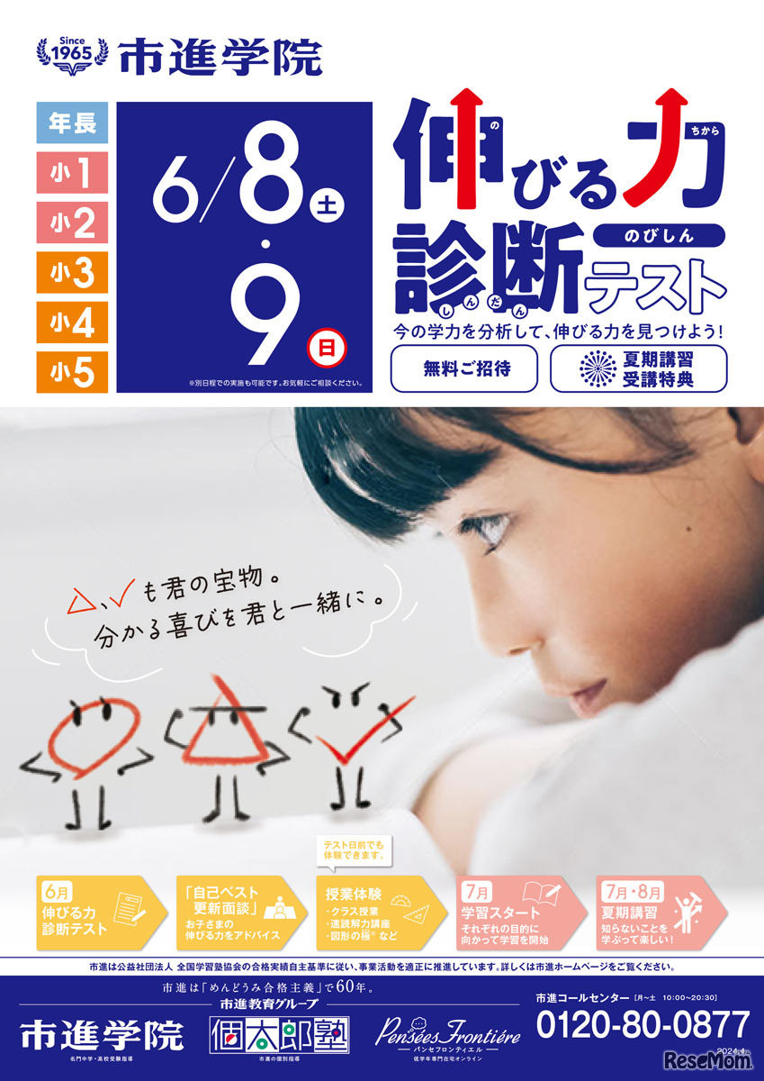 市進学院・市進予備校では、2024年5月、6月に、自分の今の学力を客観的に分析し、夏に向けてステップアップすることを目標にした、学年別・目的別の「学力診断」を実施する。対象は年長、小学生、中学生、高校生。