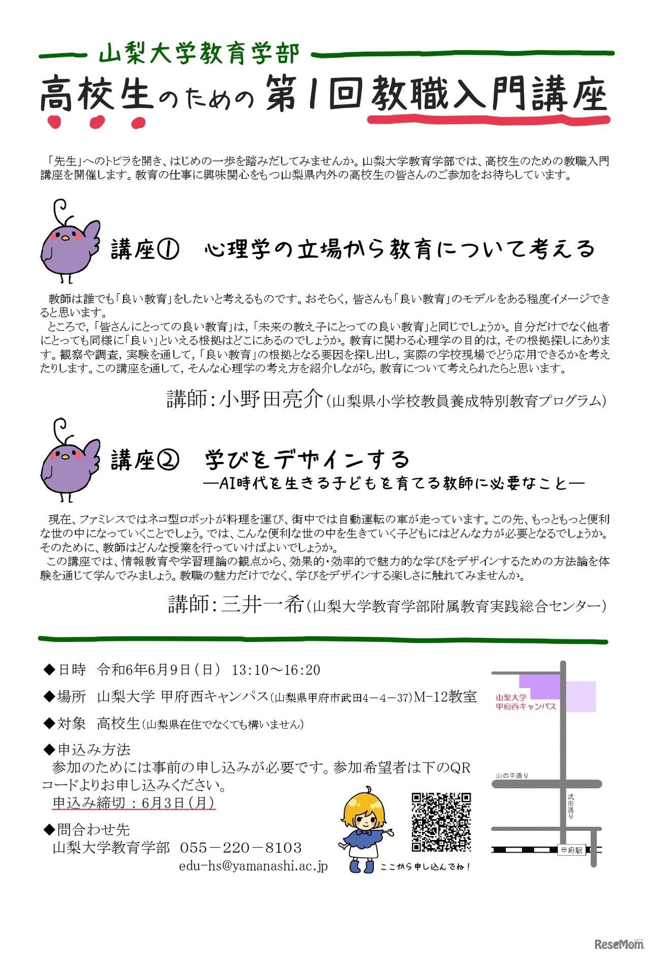 山梨大学教育学部は2024年6月9日、高校生のための教職入門講座 「さあ、『教育者』へのトビラを開こう!」を山梨大学甲府西キャンパスにて開催する。山梨在住以外の高校生も参加できる。事前申込制。申込期限は6月3日。