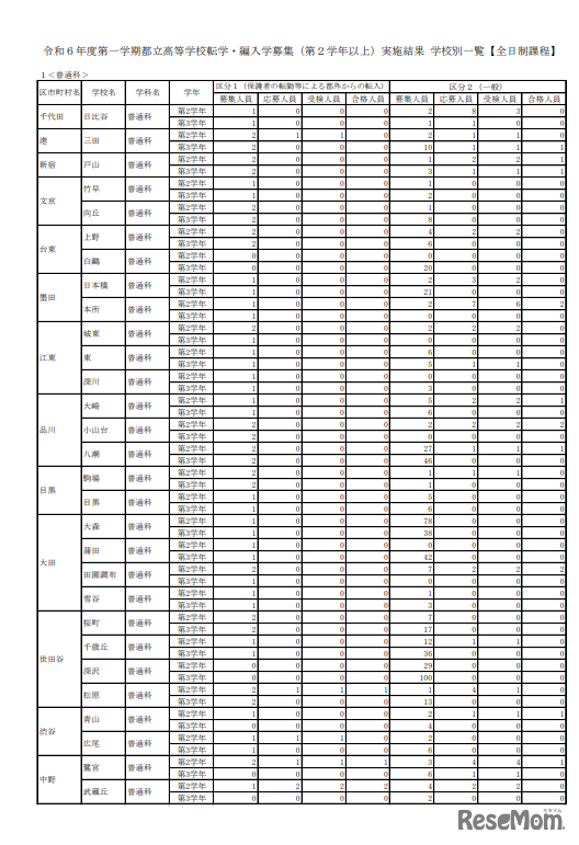 画像出典:東京都教育委員会 令和6年度(2024年度)第一学期都立高等学校転学・編入学募集(第2学年以上)実施結果 学校別一覧(全日制課程・一部)