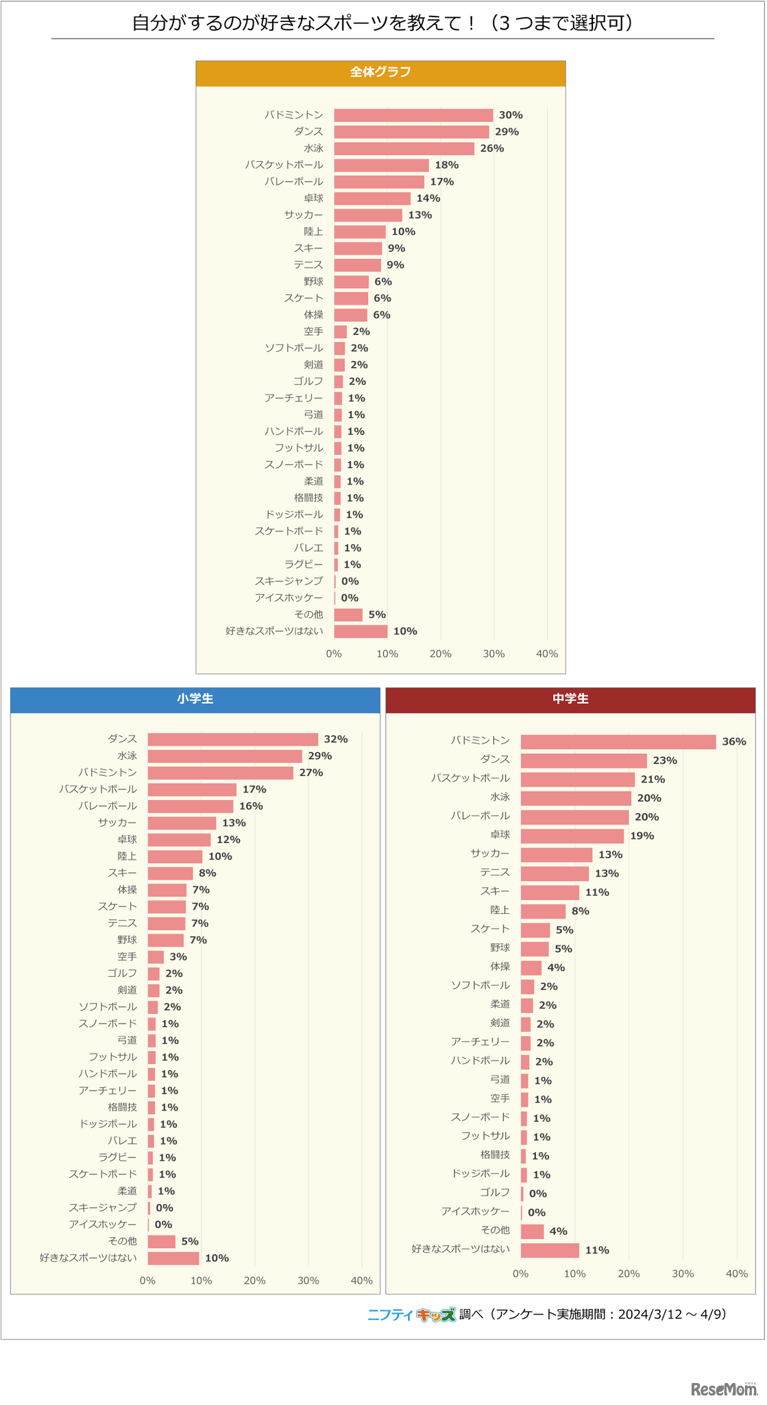 ニフティは「ニフティキッズ」で「スポーツ」に関するアンケート調査を実施し、2024年5月16日に結果を公開した。体育の授業は4割の生徒が好き、3割が嫌いと回答しており、苦手な種目の1位は、小学生が「水泳」、中学生が「長距離走」であることがわかった。