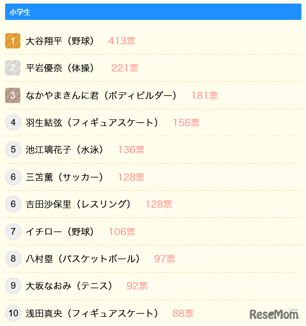 画像出典:ニフティキッズ 応援している日本のスポーツ選手は?(小学生回答:複数選択)
