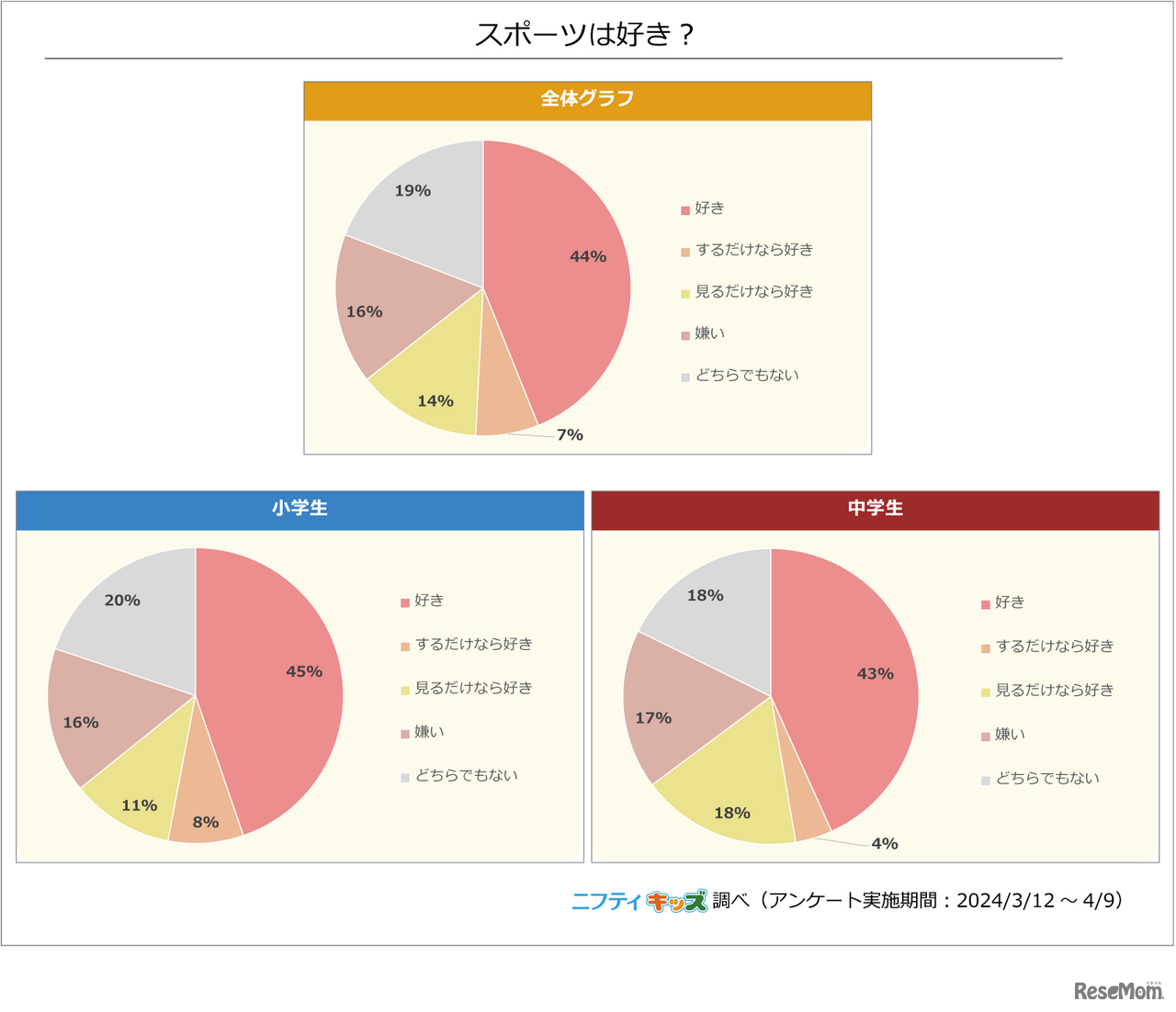 ニフティは「ニフティキッズ」で「スポーツ」に関するアンケート調査を実施し、2024年5月16日に結果を公開した。体育の授業は4割の生徒が好き、3割が嫌いと回答しており、苦手な種目の1位は、小学生が「水泳」、中学生が「長距離走」であることがわかった。