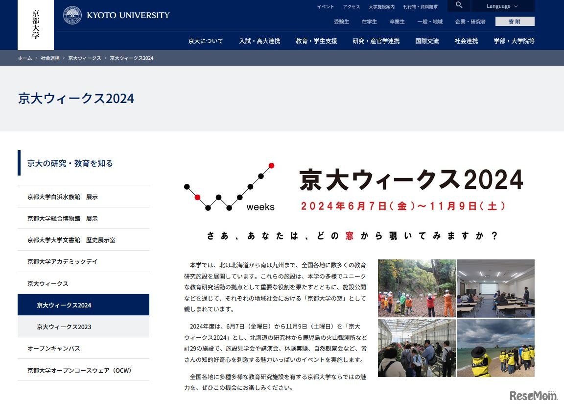 京都大学は2024年6月7日から11月9日、「京大ウィークス2024」を開催する。北は北海道から南は九州まで、京都大学が全国各地に展開する計29の教育研究施設で、施設見学会や講演会、体験実験、自然観察会など、多彩なイベントを展開する。