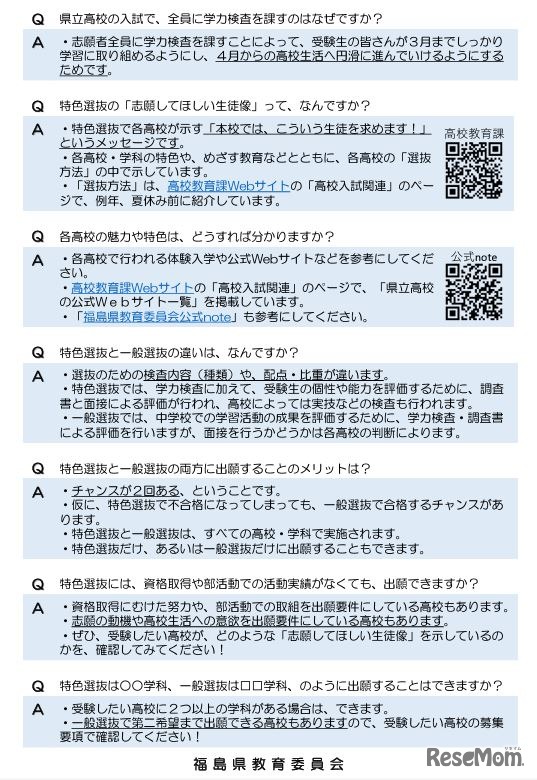 福島県教育委員会は2024年5月16日、2025年度(令和7年度)福島県立高等学校入学者選抜の受験生向けリーフレット「福島県立高等学校をめざすみなさんへ」をWebサイトに掲載した。入試制度や出願要件などについて、Q&A形式でわかりやすく紹介している。