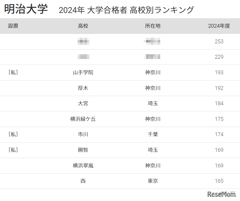 大学通信は、2024年度入試における大学合格者の高校別ランキングを特集している。「明治大学」合格者の高校別ランキングは、3位に山手学院、4位に厚木、5位に大宮がランクイン。1位・2位は大学通信のWebサイトより確認できる。