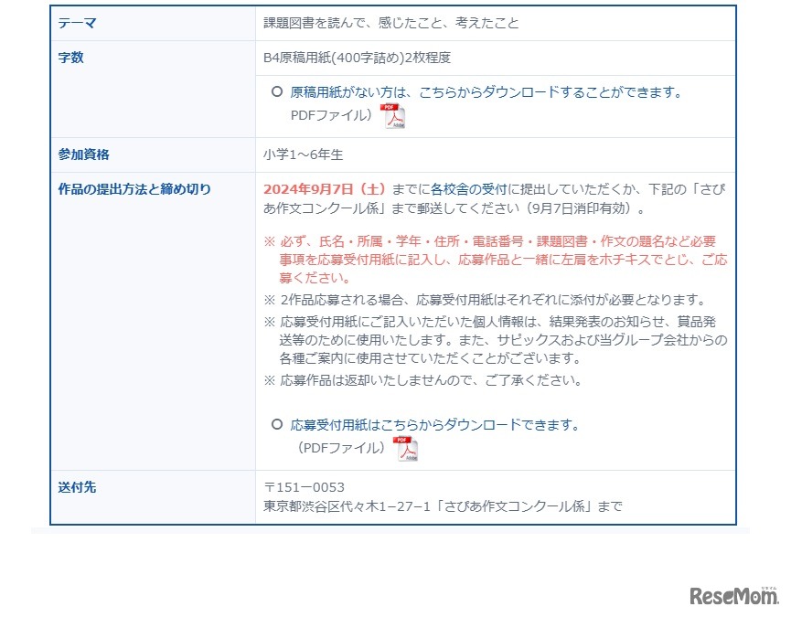 SAPIX小学部は、小学1~6年生を対象に「第28回さぴあ作文コンクール」を開催する。課題図書を読んで、感じたことなどを原稿用紙(400字)2枚程度に書く。応募締切は2024年9月7日。表彰式は11月10日(予定)。