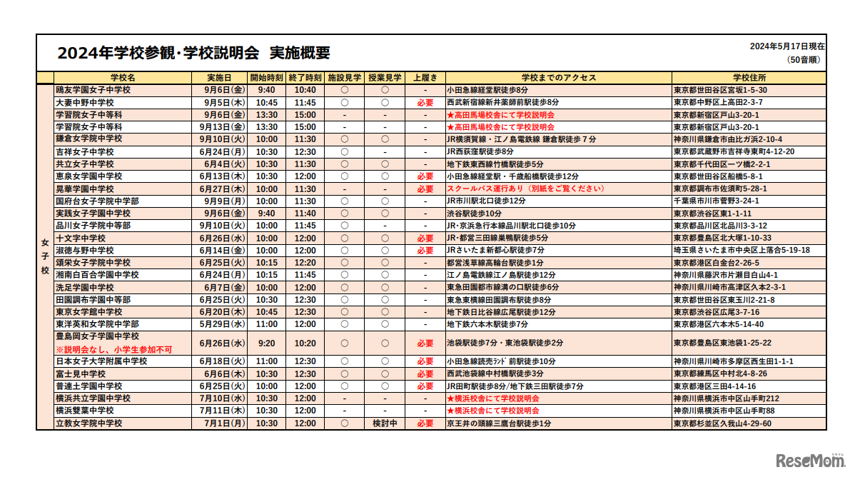 2024年度学校参観・学校説明会実施概要(女子校)