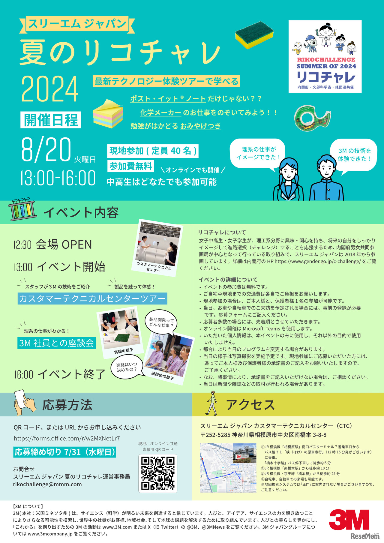 スリーエム ジャパンは2024年8月20 日、中学生・高校生に向け「3M 夏のリコチャレ2024」を開催する。3Mのカスタマーテクニカルセンターのツアーと3Mで実際に働いている技術者との座談会を行う。現地参加は定員40名(先着)、オンラインも同時開催。参加申込みは7月31日まで。