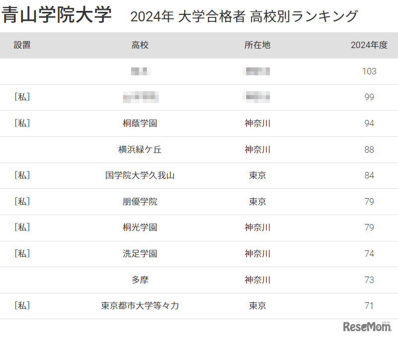 大学通信は、2024年度入試における大学合格者の高校別ランキングを特集している。「青山学院大学」合格者の高校別ランキングは、3位に桐蔭学園、4位に横浜緑ケ丘、5位に国学院大学久我山がランクイン。1位・2位は大学通信のWebサイトより確認できる。