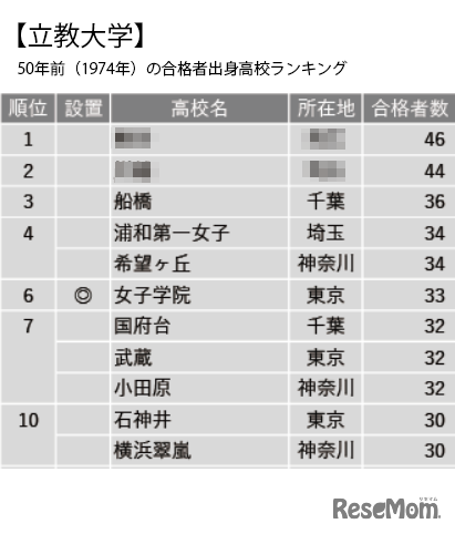 画像出典:大学通信 立教大学50年前(1974年)の合格者出身高校ランキング