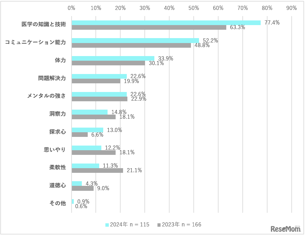 川野小児医学奨学財団は2024年5月16日、「第2回 医学生の意識調査」の結果を発表した。興味のある診療科は1位「内科」、2位「小児科」、3位「外科」となった。医師には「医学の知識と技術」「コミュニケーション能力」「体力」が必要と考える医学生が増えていることがわかった。