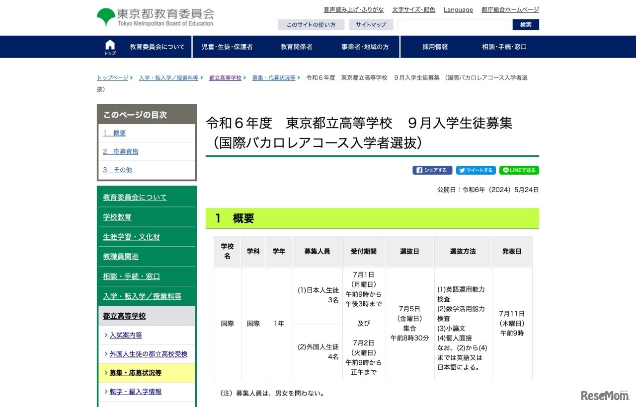東京都教育委員会は2024年5月24日、都立高校における海外帰国生徒・在京外国人生徒対象および国際バカロレアコースの2024年度(令和6年度)9月入学生徒募集に関する情報を公表した。帰国生等は三田、竹早、南葛飾など計9校、国際バカロレアは国際高校で実施。募集人員は各校ごとに異なる。なお、帰国生を対象とした第2学期転学・編入学は4校で実施する。