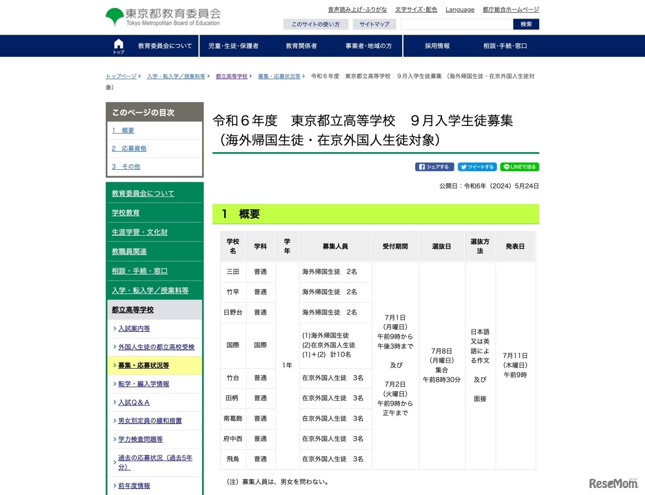 東京都教育委員会は2024年5月24日、都立高校における海外帰国生徒・在京外国人生徒対象および国際バカロレアコースの2024年度(令和6年度)9月入学生徒募集に関する情報を公表した。帰国生等は三田、竹早、南葛飾など計9校、国際バカロレアは国際高校で実施。募集人員は各校ごとに異なる。なお、帰国生を対象とした第2学期転学・編入学は4校で実施する。